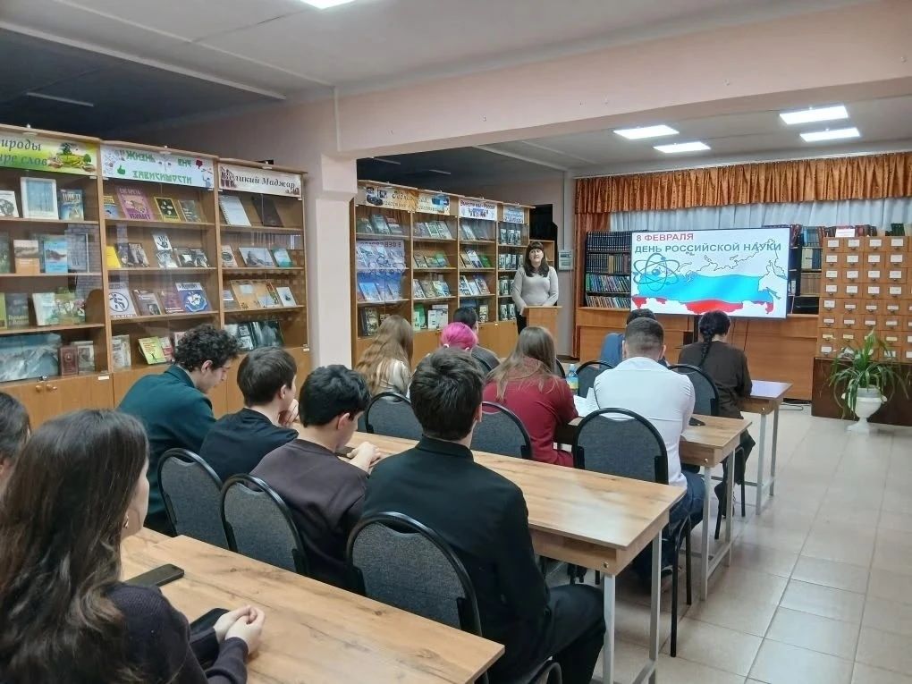 В Городской библиотеке совместно с обучающимися Будённовского медицинского колледжа было проведено познавательно-интеллектуальное мероприятие, посвященное официальному государственному празднику - Дню российской науки, который ежегодно отмечают в России 8 февраля. Студенты первого курса (группа 120ф) подготовили доклады об истории этого праздника и последних научных открытиях в медицине, была представлена информация о величайших открытиях таких ученых, как Михаил Ломоносов, Константин Циолковский, Игорь Курчатов, достижениях отечественных нобелевских лауреатов – Ивана Павлова, Ильи Сеченова, Льва Ландау. Ребята окунулись в мир просвещения и научных открытий, полезных изобретений человечества, без которых невозможно жить в современном мире. В завершение мероприятия прошла викторина, в ходе которой участники активно отвечали на вопросы, демонстрируя свой кругозор, эрудицию и интерес к науке.