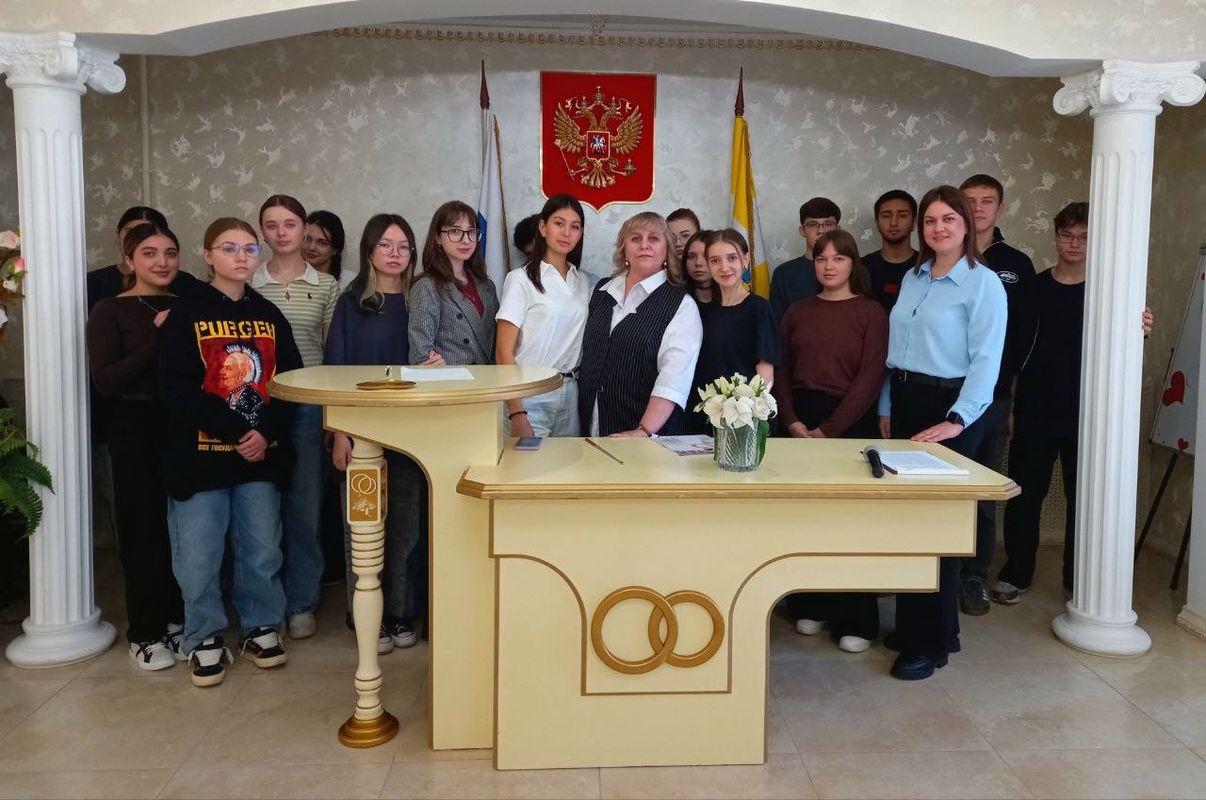 Учащиеся побывали в торжественном зале, где специалисты подробно рассказали о возрастных ограничениях и условиях заключения брака в России, а также осветили важные аспекты семейного права.